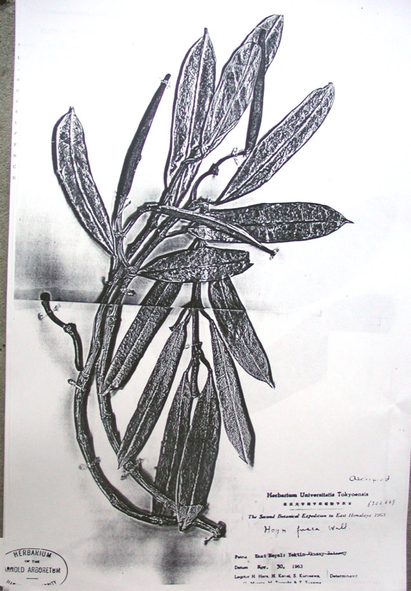 In Flora of British   India 4 (1883) 58.  J. D.  Hooker. 24. H. fusca, Wall. Pl. As.  Rar. i. 68, t. 75, and Cat. 8157; glabrous, leaves 6-9 in. linear-oblong  acuminate fleshy midrib very thick, peduncles short and pedicels very stout,  corolla pubescent within. Wight Contrib. 37; Decne. in DC Prodr. viii. 639.