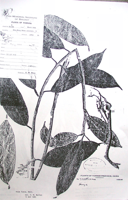 In Sunyatsenia 4 (1939) 124-125. E. D. Merrill. Hoya fusca Wallich, Pl. As. Rar. 1: 68, t. 75. 1831; Tsiang in Suny. 3: 172. 1936. Yunnan: Ma-Kwan alt. 1800 m., H. T. Tsai 51935, March 1933; Ping-Pien, H. T. Tsai 62175, June 1934; Shang-Pa. alt. 2300 m. H. T. Tsai 54300, Sept. 1933; Dzung-Duei, Cham-Pu-Tung, alt. 2000 m., C. W. Wang 66992, Oct. 1935; Chen-Kang, alt. 2700 m., C. W. Wang 72288, March 1936. Distribution: Sikkim-Himalaya; Indo-China: Nepal; Pegu; China-Yunnan and Kwangsi