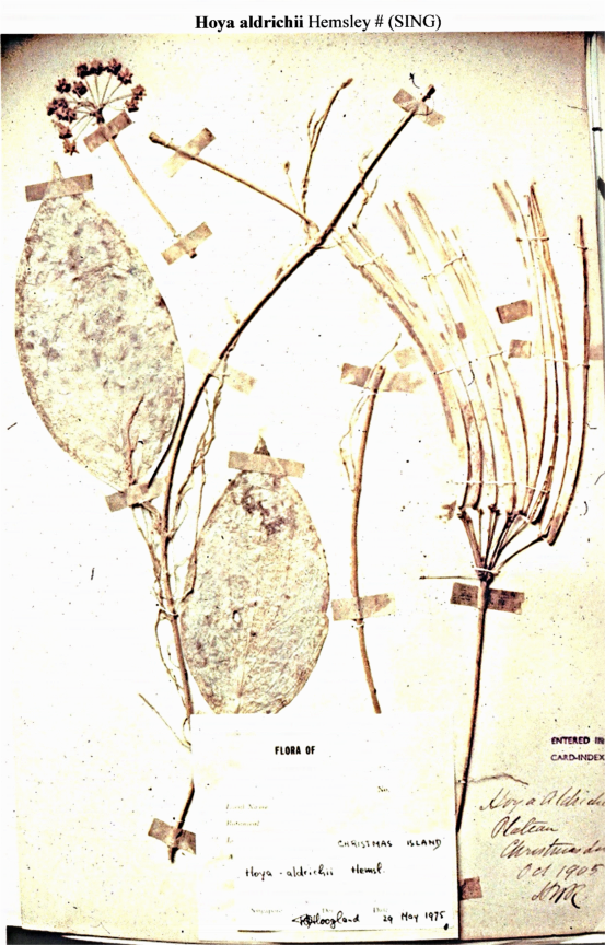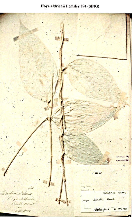 In the Journal of the Linnean Society 25 (1889-1890) 355. Hemsley. Hoya aldrichii Hemsl. n. sp. Affinis H. cinnamomifolia, differt foliis quinquenervis floribus minoribus albidis vel rubris petalis supra pubescentib